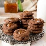 These Fig Chocolate Thumbprint Cookies are made with a chocolate sugar cookie base, rolled in sugar, and baked with an indention. Filling these thumbprint cookies is fig preserves.