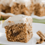Flavors of cinnamon, allspice, and nutmeg make these raisin spice cake bars flavorful. The addition of applesauce makes these cake bars moist and delicious! The brown sugar cream cheese frosting creates a creamy and smooth topping for this already delicious dessert.
