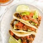 These restaurant-style ground beef tacos are made with a homemade blend of seasonings and spooned into corn tortillas. Topping these authentic tacos is fresh red salsa, tomatoes, and lettuce.